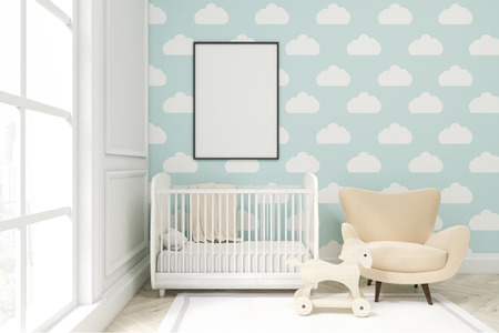 垂直フレーム ポスター クレードル 肘掛け椅子 おもちゃの馬と子供部屋のクローズ アップ ある大規模なウィンドウとライトブルー雲の壁紙 3 D レンダリング モックアップします の写真素材 画像素材 Image